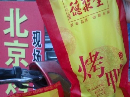 [摘要] 全聚德烤鴨只賣30元?在北京西站附近銷售的“全聚德烤鴨”的流動攤販車上掛著“北京烤鴨25元/只”的牌子,而包裝則是用的“全聚德”的包裝袋。在北京前門全聚德烤鴨店,一只不含配料、包裝和禮盒,重1千克的烤鴨售價為108元。然而,記者暗訪卻發現,幾乎同樣重量的“全聚德烤鴨”在北京西站附近的流動攤販上售價僅為30元。