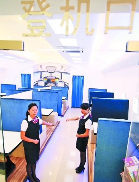“歡迎登機!”一進入餐廳,你就能看到服務員彎著腰,做出歡迎的手勢。“我們的服務員都是參考空姐的標準來招收,要求身高160cm以上,長相清秀,笑容甜美等。”黃慧玲介紹說,服務員統一著空姐制服,上班前還得接受餐飲禮儀和空姐服務方面的培訓。