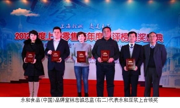 2013年1月8日,由解放日?qǐng)?bào)報(bào)業(yè)集團(tuán)下屬新聞晚報(bào)主辦,上海百貨商業(yè)行業(yè)協(xié)會(huì)、上海連鎖經(jīng)營(yíng)協(xié)會(huì)、上海購(gòu)物中心協(xié)會(huì)協(xié)辦的商業(yè)精英論壇暨2012年上海零售商總評(píng)榜在外灘威斯汀酒店舉行。永和食品(中國(guó))有限公司(商品名:永和豆?jié){)榮獲2012年度上海零售商“年度公益貢獻(xiàn)獎(jiǎng)”榮譽(yù)。品牌公共事務(wù)室林志誠(chéng)總監(jiān)代表企業(yè)赴會(huì)領(lǐng)獎(jiǎng)。