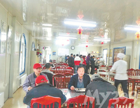 200多平方米的食堂,能容納近百人同時用餐,在墻上的食譜板上寫著“扣肉、小雞燉蘑菇、菜心燒木耳、土豆絲、柿子炒雞蛋、糖醋黃瓜”,免費的綠豆粥已經(jīng)盛在了保溫桶中。兩葷兩素8元錢,米飯給的量足夠20多歲的小伙子吃。
