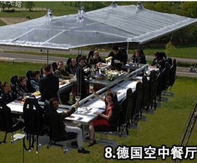 2008年8月25日,16名客人在離地50米高的“空中餐廳”享用一頓大餐。這個被叫做“空中餐廳”的項目是由一家德國探險體驗公司推出的,食客如果想要在這個被起重機懸吊起來的餐廳品嘗美味,每個人需要花費159歐元。而想試的朋友也不用跑到德國那么遠去,最近在中國的上海也已經(jīng)有了這樣的“空中餐廳”了,大膽的你可以去挑戰(zhàn)一下了。