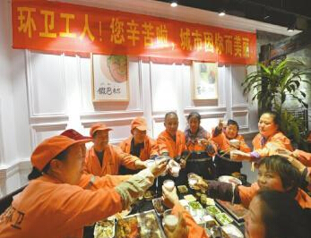 “謝幺爸,你不是經(jīng)常吼好想吃頓火鍋得嘛,今天可以敞開肚皮整哦!”“今天就算我們提前團(tuán)年啦!來大伙一起喝一杯。”180名環(huán)衛(wèi)工人一邊燙著火鍋,一邊擺著龍門陣。原來,這些被邀請來的環(huán)衛(wèi)工們,全部為轄區(qū)一線的環(huán)衛(wèi)工,平均年齡50多歲。50多歲的李大姐干環(huán)衛(wèi)工已有八年時(shí)間,她說,今天的火鍋不僅味道巴適口感舒服,更覺得心里暖和。吳大姐接過話來,“你看這么漂亮的店堂還專門貼上了標(biāo)語:“最辛苦的人——環(huán)衛(wèi)工人”;“環(huán)衛(wèi)工人!您辛苦啦,城市因你而美麗”真讓人感覺貼心、暖心……