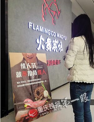 位于南岸區時代星光廣場的火舞炭燒主營炭燒、烤肉,他們打出的廣告詞是———情人節,就不接待情人(如圖)。“我已經給服務員打好招呼,遇到手挽手成雙成對的恕不接待。”老板蔡彥旭,情人節不能只有耍朋友的開心了,單身的人悲傷度過。他準備唱反調到底,他還會給屆時前來就餐單身人士準備一份禮物。
