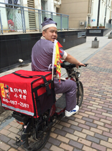 你可以想象這樣一個場景:車來車往的都市,長安街上,一個大俠裝扮的古裝小哥騎著電動車風馳電掣,一桿杏黃旗上書“蝦鼎記”在車流中隨風飄蕩,無數路人好奇地拿起手機拍照、發微博和朋友圈,甚至要求合影。到了客戶家:“大俠您好,我是蝦鼎記神行太保……”客戶接過熱氣騰騰的海鮮,驚喜之余又接過一個骰盅、四枚骰子,點餐即可獲得一次搖骰子機會,四個六免單,四個六以外點數相加減掉相應錢數。于是,喜上加喜。