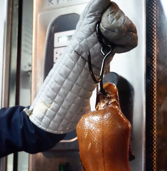 烤鴨一出爐,就會(huì)被立刻分割,如果沒(méi)有馬上做成漢堡送到運(yùn)氣超好的客人的嘴里,就會(huì)把分好的鴨皮和鴨肉分開專門保溫。對(duì)烤鴨了解至極的大董專門為鴨皮和鴨肉分別設(shè)計(jì)了不同的保溫箱,溫度和濕度都不一樣,以保持剛出爐的風(fēng)味。鴨子最多在里面呆四十分鐘,這是大董認(rèn)為可以保持鴨皮噴香酥化、鴨肉多汁鮮嫩的完美狀態(tài)的時(shí)間范圍。在這個(gè)時(shí)間內(nèi)沒(méi)有用完的鴨子,就不要了。