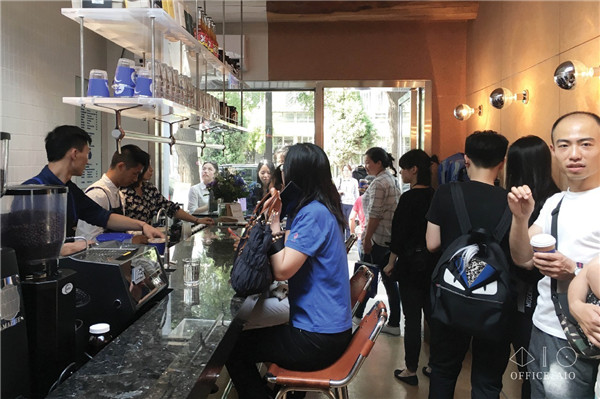 墻邊的不銹鋼板適合趕時間的顧客站立享用飲品,或等待時使用;吧臺延伸到門外的平臺,也為戶外提供了座位/站位。店中座椅選擇了高腳皮椅,店外水泥平臺上特意劃分了不在主動線上的兩個區(qū)塊,以不銹鋼板覆蓋,變成了應(yīng)付過多客流的臺階座位。說實話都不是“久坐之處”,這樣設(shè)計明確的空間,客人自然不會當它是“閑來無事躺上半天”的地方。