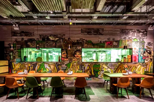 成名于香港的梁經倫自然不會錯過這個有意思的“罪惡據點”。Daimon Bistro的入口是一扇深褐色的鐵門,從曖昧的紫色燈光開始,破舊的木板墻、模仿腳手架搭起的竹吧臺、陳舊的電表、半開放式廚房外的涂鴉墻,連客人的衣帽間都被設在鐵網區域內……每個細節似乎都是九龍城寨的縮影。