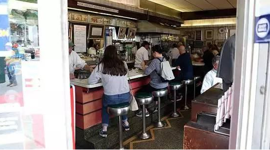 長長的柜臺(tái)配著一排高腳凳和舒適的L型用餐區(qū),這個(gè)經(jīng)典紐約小餐館的時(shí)光仿佛定格在了1940年,餐館里到處都是被木隔斷分開的塑料椅子和膠木桌子。
