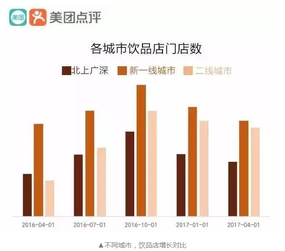 根據美團點評公布的一項數據顯示,2017年4月,二線城市飲品店門店數同比增長為29%,而在北上廣深,這個數字是6% 。